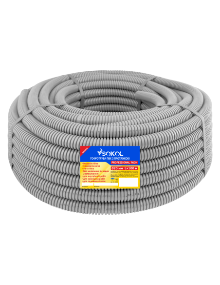 Гофрированная ПВХ труба Sokol Professional d20 представляет собой пластиковые трубчатые каналы для установки в них электрических кабелей, для защиты от пыли, влаги