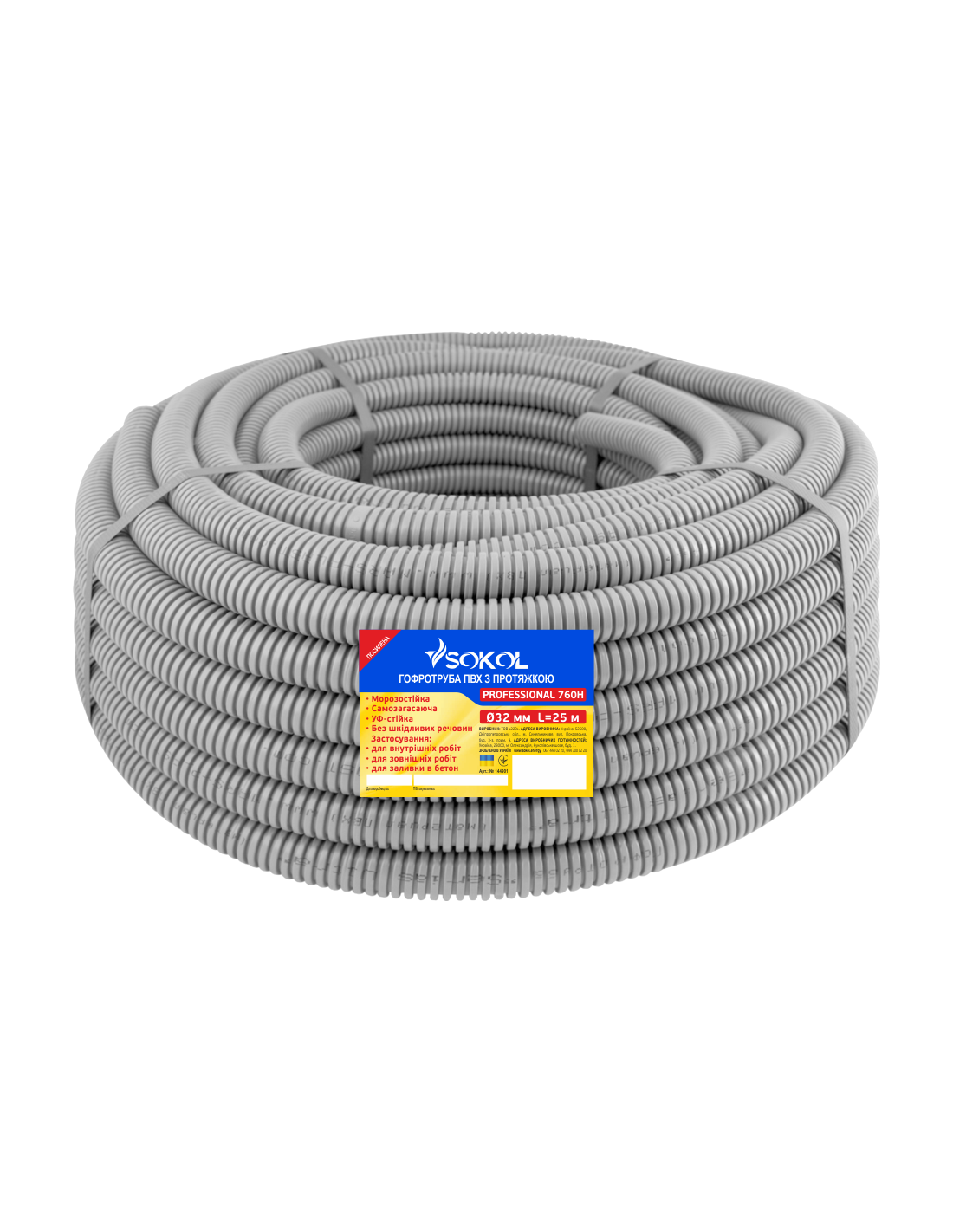 Гофрована труба ПВХ Sokol Professional d32 являє собою пластикові трубчасті канали для встановлення в них електричних кабелів, для захисту від пилу, вологи